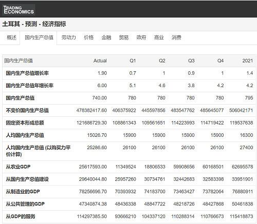 根據(jù)《交易經(jīng)濟(jì)學(xué)》全球宏觀(guān)模型和分析師的預(yù)期,到本季度末,土耳其的GDP年增長(zhǎng)率預(yù)計(jì)將達(dá)到5.10%。展望未來(lái),我們估計(jì)土耳其的GDP年增長(zhǎng)率在12個(gè)月內(nèi)將達(dá)到4.20。從長(zhǎng)期來(lái)看,根據(jù)我們的計(jì)量經(jīng)濟(jì)學(xué)模型,預(yù)計(jì)土耳其的GDP年增長(zhǎng)率將在2021年達(dá)到4.20%左右。