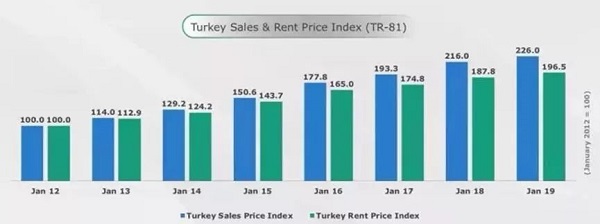 2010年至2018年期間,土耳其房?jī)r(jià)持續(xù)上漲,全國(guó)房產(chǎn)均價(jià)上漲2.5倍,而核心城市伊斯坦布爾更是上漲3倍,成為全球房?jī)r(jià)增長(zhǎng)速度最快的第十大城市;今年1月,土耳其各個(gè)城市住宅租金價(jià)格同比去年增長(zhǎng)了4.6%。土耳其蓬勃發(fā)展的房產(chǎn)市場(chǎng)聚焦了全球越來(lái)越多投資人的關(guān)注。