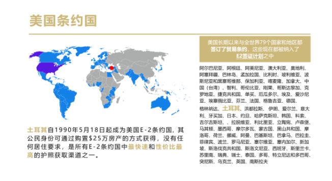 條約國和地區包括:加拿大、英國、德國、土耳其、新加坡、日本、韓國、中國臺灣等79個國家和地區。由于中國并未在條約國范圍內,因此想要申請E-2簽證的中國投資者首先需成為條約國公民。