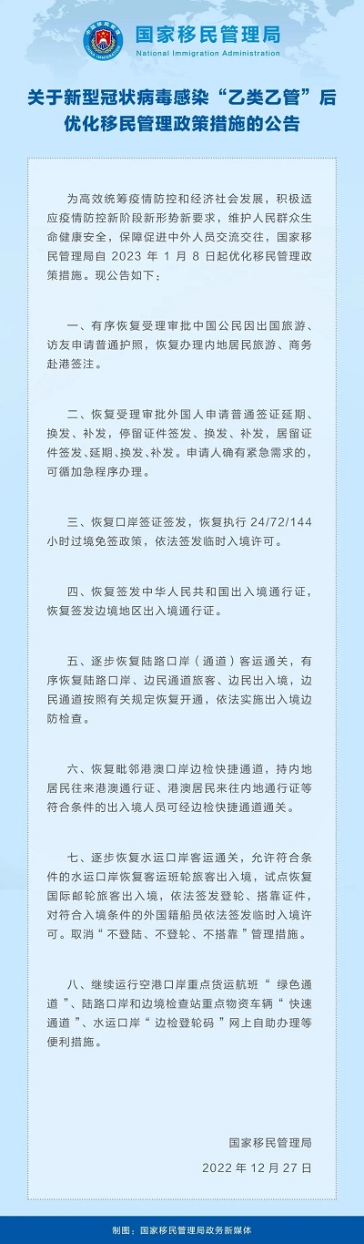 為高效統(tǒng)籌疫情防控和經(jīng)濟(jì)社會(huì)發(fā)展,積極適應(yīng)疫情防控新階段新形勢(shì)新要求,維護(hù)人民群眾生命健康安全,保障促進(jìn)中外人員交流交往,國家移民管理局自2023年1月8日起優(yōu)化移民管理政策措施。