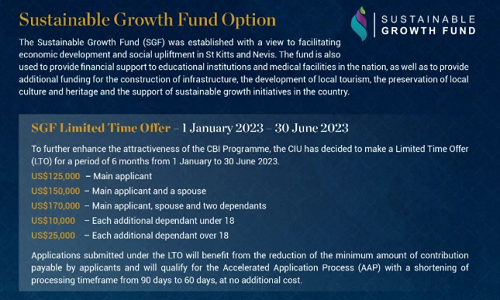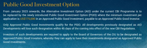 從2023年1月起,CBI項目下的另類投資選擇(AIO)將被新引入的公益投資選擇(PGIO)所取代,每個申請的最低投資額為175,000美元。