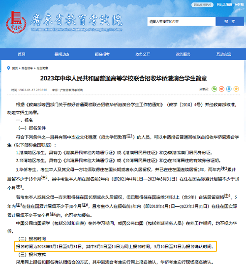 2023年1月17日,廣東省教育考試院發(fā)布了《2023年中華人民共和國普通高等學校聯(lián)合招收華僑港澳臺學生簡章》,官宣了報名時間等信息: