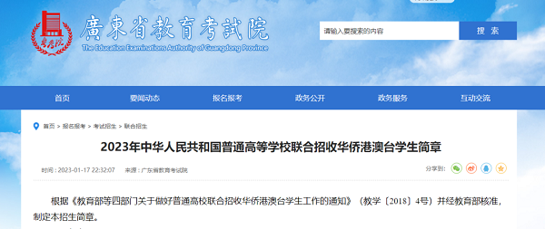 2023年1月17日,廣東省教育考試院正式公布《2023年中華人民共和國普通高等學校聯合招收華僑港澳臺學生簡章》(簡稱:《簡章》)。