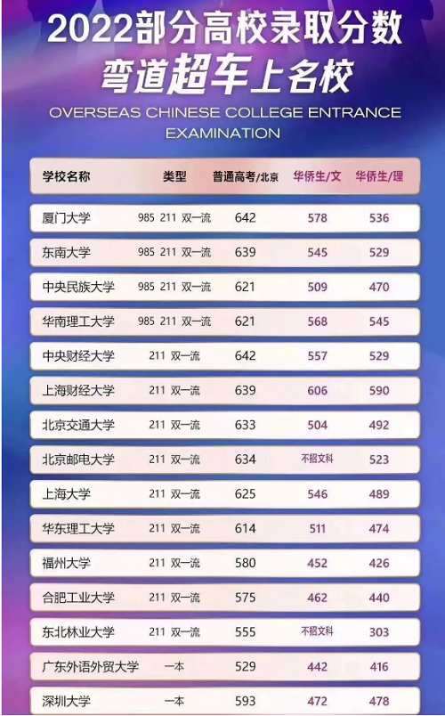 同樣是滿分750分,華僑生的錄取分數線比統招生低。根據2022年的招生數據,參加華僑生聯考,300-400分的總分(滿分750)即可入讀國內的高校,當然如果追求是“清北”,分數要求也是會相對提高很多的(600分+),但考慮到考試難度,還是比普通高考要容易許多