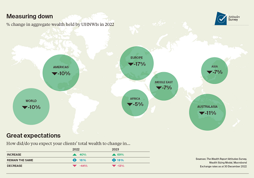 去年充滿挑戰的市場令大多數超高凈值人士的財富縮水,幅度達到10%(相當于10.1萬億美元)。其中,歐洲處于最嚴重的位置,平均下降17%,而非洲表現出最大的韌性,僅下降5%。