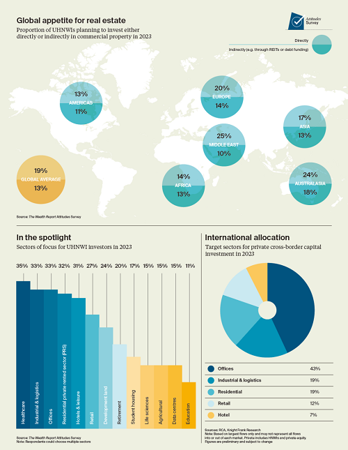 在未來一年,19%的超高凈值人士打算直接投資地產創收,13%的人打算采取間接途徑。就需求行業而言,醫療保健行業領先,其次是物流、辦公和住宅。