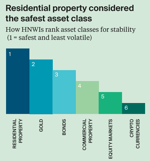 據《高凈值人士投資意向調查》,全球高凈值人士認為住宅物業是最安全的資產類別。此前黃金通常是最安全的選擇。股票市場和加密貨幣在2022年的表現都很不穩定,分別降至第五和第六位。