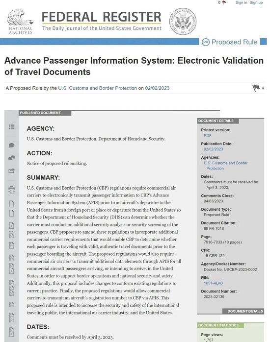 據Viewfromthewing消息,美國海關與邊境保護局CBP遞交提案要求,所有乘坐美國航班的乘客需提供在美地址、兩個電話號碼和電子郵件地址,任何不遵守或不能提供以上信息的乘客將被拒絕登機。