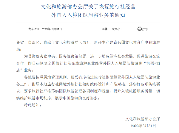 3月31日,中國文化和旅游部發布通知,即日起恢復全國旅行社及在線旅游企業經營外國人入境團隊旅游和“機票+酒店”業務。