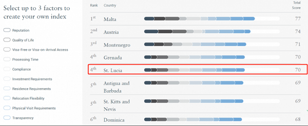 《全球公民計劃指數(shù)》從聲譽、生活品質(zhì)、免簽證或落地簽證、項目處理時間、合規(guī)、投資要求、居住要求、搬遷靈活性、實際訪問要求、透明度等10個方面對 14 個項目進行排名,圣盧西亞在此次排名中以70分,位居第四。