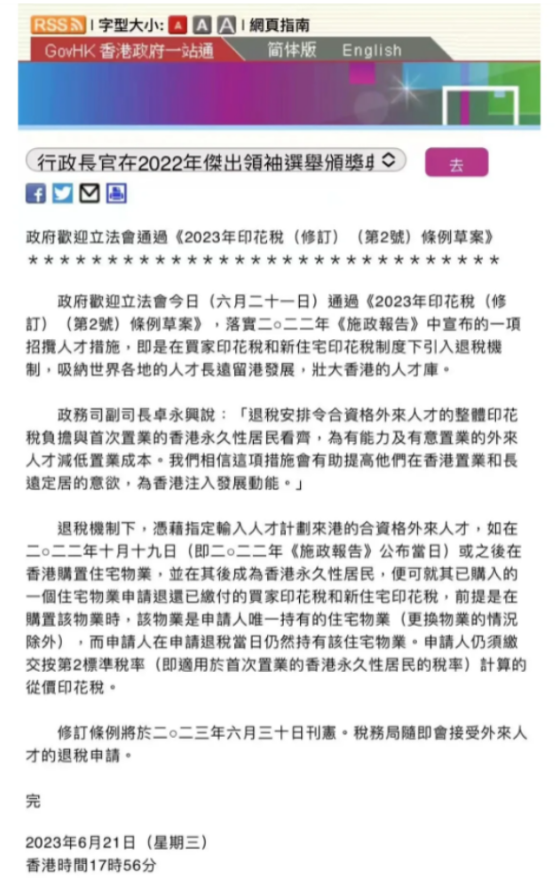 于2022年10月19日或之后(即2022年《施政報告》公布當日或之后)在香港購置住宅物業,并在其后成為香港永久性居民及符合相關條件便可申請退還其在港購買首套住宅時所額外多支付的買家印花稅和新住宅印花稅。