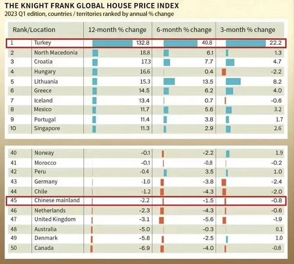 而近日,世界知名房地產咨詢服務公司萊坊國際(KNIGHTFRANK)發布了 2023 年第一季度全球房產價格指數,報告顯示近一年全球房價平均漲幅為 3.6%,是自 2015 年以來呈現出的最低增長速度。其中,土耳其以 132.8%的房價漲幅再次領跑全球。