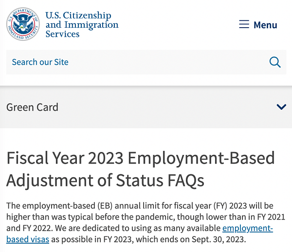 美國移民局在職業移民綠卡的頁面內更新了內容:2023財年內可用的職業移民綠卡數量會比正常情況多一些,但會少于2021財年和2022財年的可使用數量,我們會盡全力把2023財年可用的綠卡數量都用完。