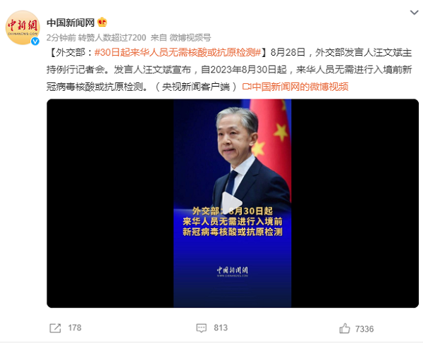 據中新網等報道,北京時間8月28日,中國外交部發言人汪文斌在例行記者會上宣布,自2023年8月30日起,來華人員無需進行入境前新冠病毒核酸或抗原檢測。