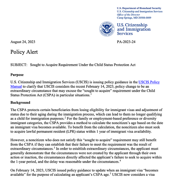 好消息!近日,美國移民局更新了審案手冊——Policy Manual,將此前的表B鎖齡新政設定為特殊情況,在該特殊情況下可以豁免那些因為政策變動而未來得及在一年內遞交I-485申請,完成“seek to acquire”動作的子女。
