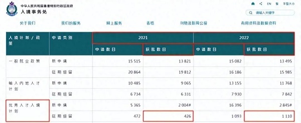 從香港入境處公布的數據看,2021年的續(xù)簽獲批量有426宗;2022年則有1110宗。