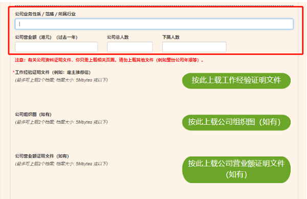 每一份工作填寫頁面后附加相關材料上傳,取消了“公司資本”、”繳納稅款“的信息填寫.