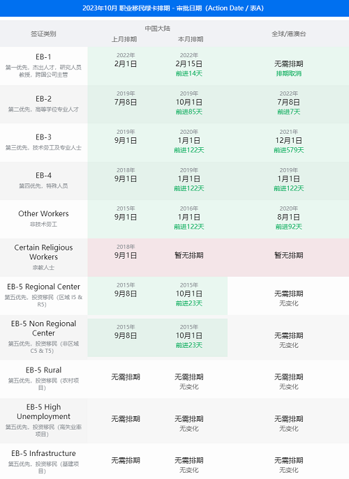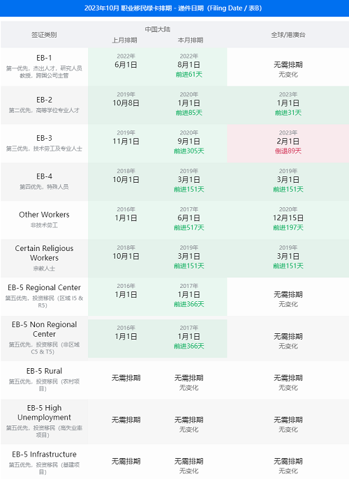 10月排期表中美國EB-5 投資移民類中國大陸出生的申請人A表排到2015年10月1日,但B表排期大躍進:從2023年9月排在2016年1月1日一下子跳躍到2017年1月1日!如此大幅度地前進,對身在美國的EB-5主申請人是個大好消息。這意味著這些申請人可以在美國遞交I-485調整身份的申請,隨便申請工作許可和旅行證。