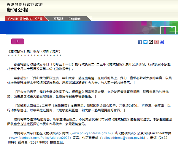 港府今年的《行政長官2023年施政報告》將于2023年10月25日發表。日前,香港特區政府就2023年《施政報告》展開公眾咨詢。