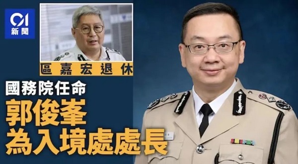 前幾日,香港根據香港特區行政長官李家超的提名和建議,任命郭俊峯為入境事務處處長,免去區嘉宏的入境事務處處長職務。