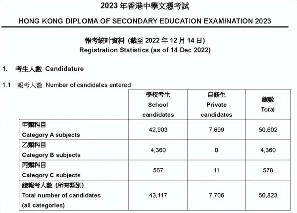 據香港考評局最新公布的2023年香港中學文憑考試(HKDSE,俗稱“香港高考”)報考統計數據,2023年香港DSE報考人數為50,823人,僅為內地高考報考人數的0.39%。