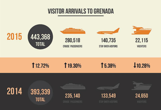 根據(jù)加勒比自由貿(mào)易區(qū)新聞媒體局提供的報告顯示,2015年 格林納達全年旅游總?cè)丝跒?43368人次,比2014年393339增長近5萬人次,增長率達12.72%。其中乘坐油輪到達游客280518人次,同比增長19.3%。過夜游客由13359人次增長5.38%達到140735人次。但游艇游客人次由24.650人次減少10.28%至22115人次。