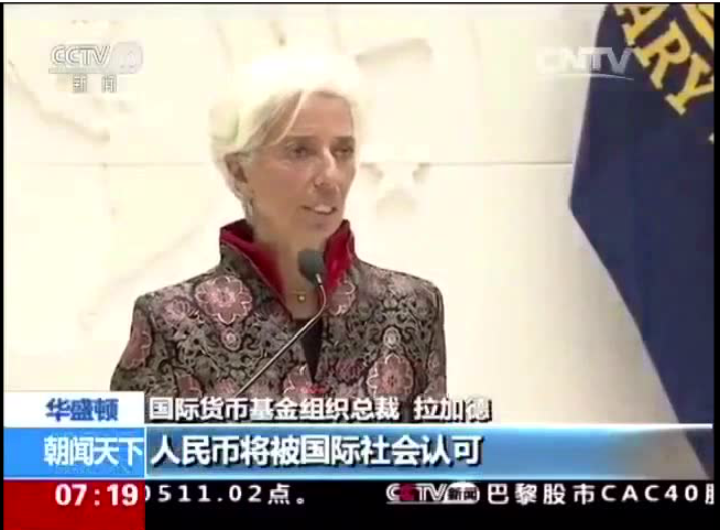 際貨幣基金組織總裁-拉加德 ,身穿中國傳統服飾宣布:“2017年10月1日開始,人民幣正式成為國際通用貨幣。”
