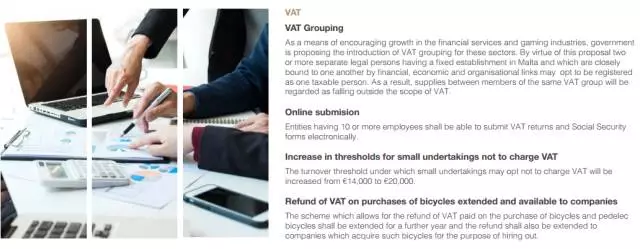 針對服務業(yè)和游戲業(yè),政府制定“打包增值稅(VATGrouping)”,也就是說,在馬耳他有兩個或多個在馬耳他有固定獨立法人的機構(gòu),并且法人在財務、經(jīng)濟和結(jié)構(gòu)組成方面有密切聯(lián)系的話,可以選擇注冊為一個應納稅人,只交一份增值稅。