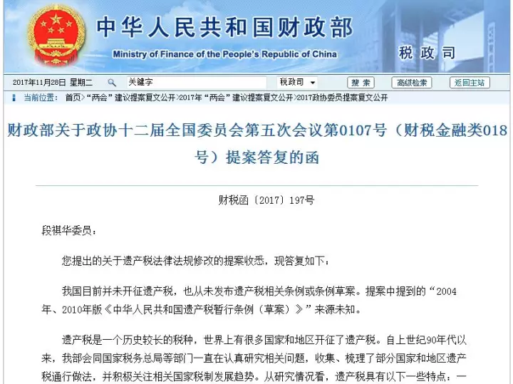 10月17日,財政部在其網站公布《財政部關于政協十二屆全國委員會第五次會議第0107號(財稅金融類018號)提案答復的函》。該函回答了全國政協委員段祺華關于遺產稅法律法規修改的提案的相關問題。