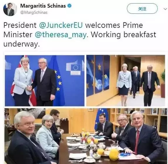 路透社、BBC等媒體報道,英國首相特蕾莎·梅凌晨乘坐夜航飛機,在周五黎明前抵達布魯塞爾與歐盟執委會主席讓-克勞德·容克進行會面。希納斯(Margaritis Schinas)之后在Twitter上發了一組照片,照片顯示雙方握手并共進工作早餐。