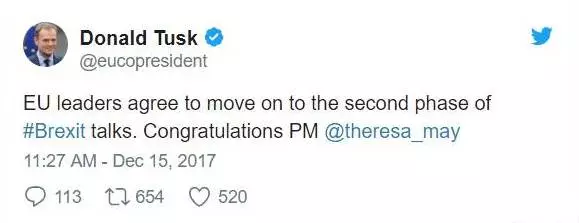 12月15日的歐盟峰會上,歐盟理事會主席唐納德?圖斯克(Donarld Tusk)表示,各成員國領導人一致同意英國“脫歐”談判第一階段取得充分進展,可以正式進入第二階段的談判。