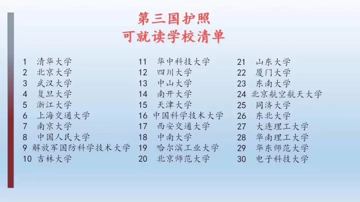 孩子如果想免筆試入讀中國名校,列表如下,需要在讀大學之前至少4年前拿到第三國護照,過去四年至少兩年在國外讀書。