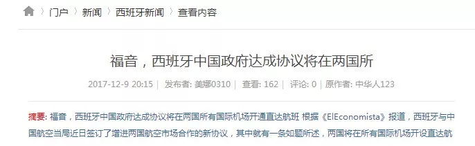 西班牙與中國航空當局近日簽訂了增進兩國航空市場合作的新協議。主要內容包括:1.兩國將在所有國際機場開設直達航班(是的,你沒有看錯,所!有!);2.完善空中運輸;3.促進包機業務。