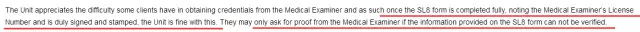考慮到圣盧西亞投資移民申請人體檢,需要提供醫生資質,給申請人帶來諸多不便,今后,申請人如果不能提供醫生資質文件,醫生填寫完SL8、簽字、蓋章、寫上醫生的資質證書編號等,移民局也會認可。只有當SL8體檢表中有移民局不能確認的體檢項目,才可能要求醫生提供相關證明文件。