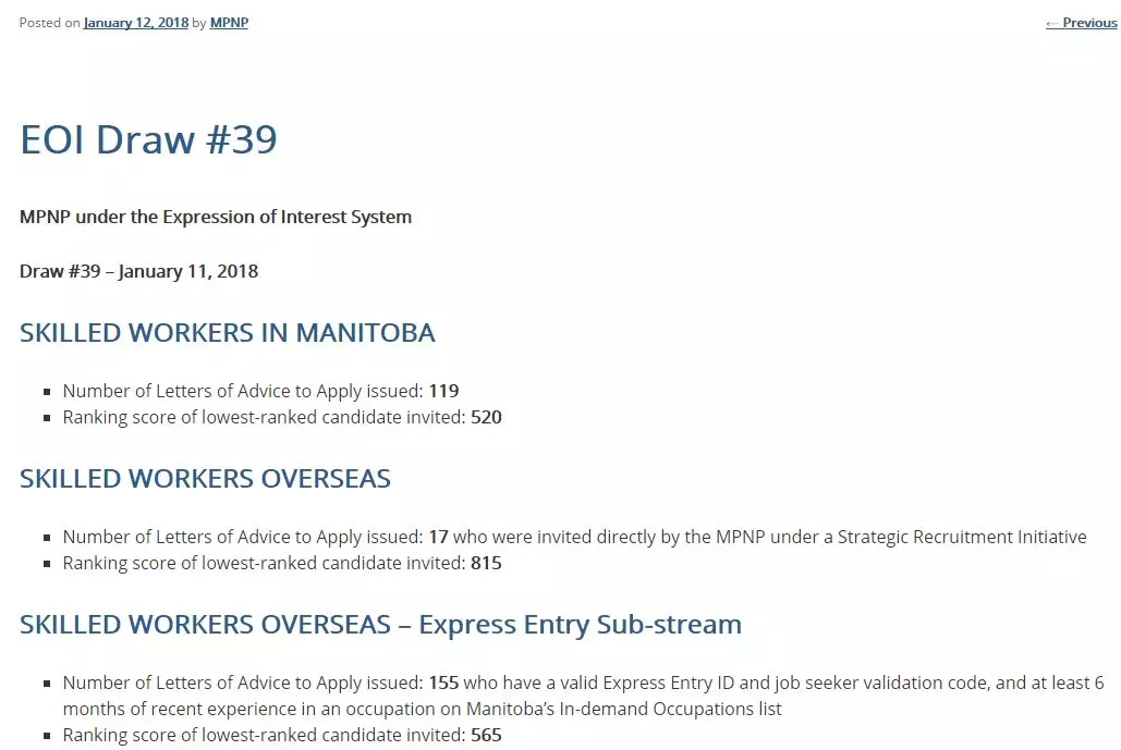 加拿大曼省省提名計(jì)劃MPNP抽簽結(jié)果出爐。其中,曼省EE(Express Entry Pathway draw)首次抽簽,共對(duì)155位候選人發(fā)出了(Letters of Advice to Apply)邀請(qǐng)。另外,其他兩類抽簽結(jié)果包括:曼省SWO下的17名技術(shù)工人,以及曼省SWM下的119位候選人,EOI最低邀請(qǐng)分?jǐn)?shù)520。