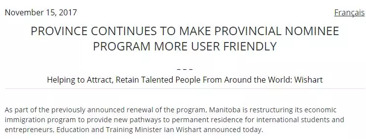 2017年11月15日,曼省政府教育與培訓(xùn)廳長(zhǎng)伊恩·威沙特(Ian Wishart)宣布與加拿大聯(lián)邦政府達(dá)成協(xié)議,重組省提名計(jì)劃,實(shí)施曼省移民新政,為國際學(xué)生、技術(shù)人員和企業(yè)家提供永久居留的新途徑。