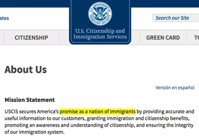 在發給衛報的郵件中,L Francis Cissna解釋到:“這個簡單明了的聲明,明確規定了該機構在我國合法移民體系中的作用以及我們對美國人民的承諾。”