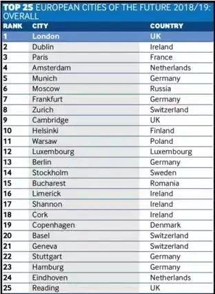 在金融時(shí)報(bào)發(fā)布的《歐洲未來城市2018/19年外商直接投資指數(shù)(Financial Times Foreign Direct Investment Index for European Cities of the Future 2018/19)》中,愛爾蘭有四座城市上榜前25強(qiáng),其中都柏林在該排名中坐擁第二,僅次于倫敦。另外三大愛爾蘭熱門投資城市利默里克、香農(nóng)和科克分別位列榜單16-18位。