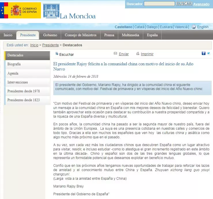 西班牙首相拉霍伊在西班牙政府官網(wǎng)上發(fā)布中國新年祝賀信