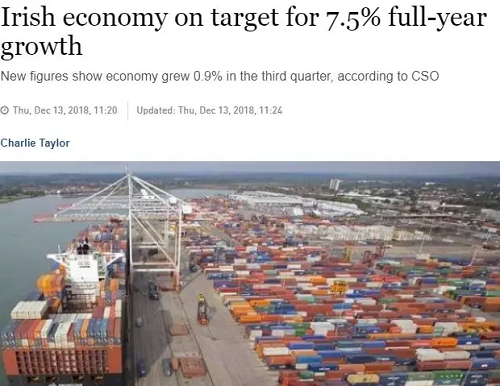 12月13日,愛爾蘭中央統(tǒng)計局(CSO)發(fā)布最新數(shù)據(jù)表明,愛爾蘭有望實現(xiàn)2018全年GDP增長7.5%的目標。