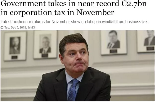 最近,愛爾蘭政府發(fā)布最新財政報表,數(shù)據(jù)顯示:2018年11月,愛爾蘭政府征收的企業(yè)稅(Corporate Tax)高達27億歐元,幾乎比此前預期多了5億歐元。