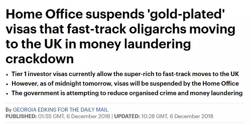 12月6日,英國(guó)內(nèi)政部(Home Office)宣布暫停200萬(wàn)英鎊移民簽證(Tier 1 Investors),當(dāng)?shù)貢r(shí)間12月7日午夜生效,直至2019年新政出臺(tái)。至此,多年被抨擊為“國(guó)際洗錢合法化”的一級(jí)投資簽證(Golden Visa),終于走到了收緊暫停的一步。