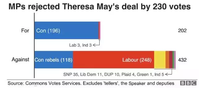英國(guó)當(dāng)?shù)貢r(shí)間15日,在英國(guó)下議院針對(duì)首相特蕾莎·梅此前與歐盟達(dá)成的“脫歐”協(xié)議表決中,下議院以432票反對(duì)、202票支持的投票結(jié)果否決了“脫歐”協(xié)議。