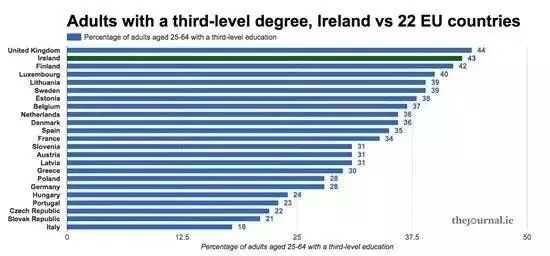 愛爾蘭政府長(zhǎng)期以來(lái)對(duì)十分重視對(duì)教育的投入。愛爾蘭政府每年在教育板塊的財(cái)政支出高達(dá)財(cái)政總支出的15%,遠(yuǎn)高于其他歐盟國(guó)家。自1985年以來(lái),政府對(duì)教育的投資增加了一倍半。大概這也是為什么愛爾蘭能成為擁有受過(guò)高等教育(Thirdlevel qualification)的25-64歲人口占比最高(43%)的歐盟國(guó)家。