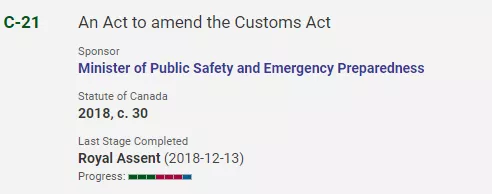 2018年12月13日,加拿大聯(lián)邦政府正式簽發(fā)了一項《海關(guān)法》(Customs Act)修訂議案:C-21法案。