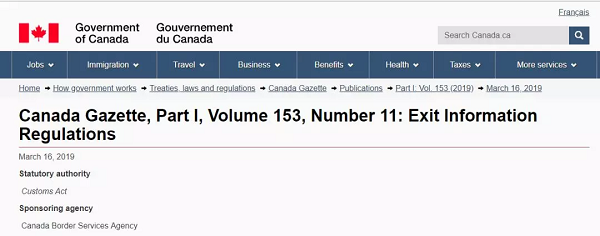 加拿大邊境服務(wù)局將于今年起實施一項新規(guī)定,對陸路和航空離境者收集包括姓名、性別、國籍、出生日期、離境時間和地點等等的基本資料。