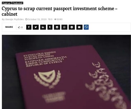 10月13日周二,塞浦路斯政府發言人Kyriakos Koushos宣布:自2020年11月1日起取消投資入籍計劃的提案。