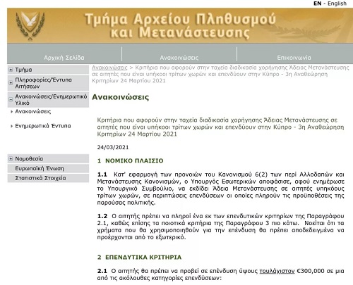 去年塞浦路斯護照項目正式關停,后續是否再開放尚未可知。想要移民塞浦路斯還可以選擇永居項目,近日塞浦路斯永居項目也進行了調整:2021年3月24日,塞浦路斯移民局官網更新辦理塞浦路斯的永居政策,即日起立即執行。