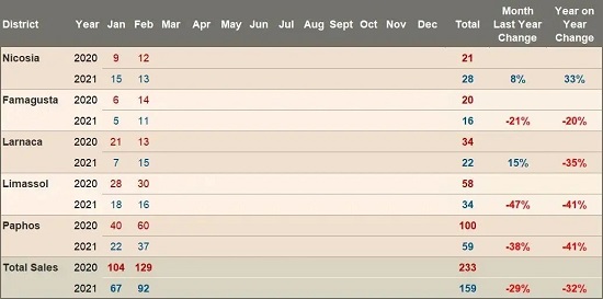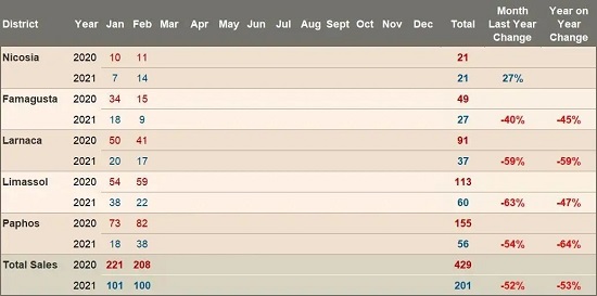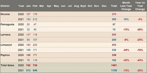 與2020年2月相比,2月份對非歐盟公民的房地產銷售下降了52%。這些都受到了雙重打擊:新冠肺炎的限制和去年11月取消塞浦路斯投資公民身份(又名“黃金護照”)計劃。