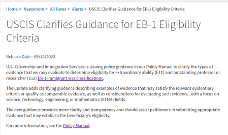 美國移民局發布針對EB-1類別杰出人才移民申請的詳細政策指南,尤其對STEM領域的申請人有利。